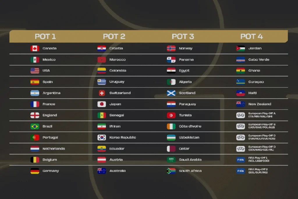A distribuição dos potes Copa 2026 segue critérios técnicos e geográficos. O pote 2 reúne seleções como Croácia, Marrocos, Colômbia, Uruguai, Suíça, Japão e Senegal, enquanto o pote 3 traz Noruega, Egito, Paraguai, Tunísia, Costa do Marfim, Catar, Arábia Saudita e outras equipes de nível intermediário. Já o pote 4 é composto por seleções como Jordânia, Cabo Verde, Gana, Curaçau e Haiti, além das vagas de repescagens global e europeias. Essas últimas serão definidas em confrontos eliminatórios antes da competição. Portanto, esse pote combina seleções de menor ranking com equipes que ainda lutam pela última vaga.